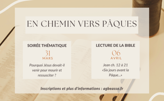Vous souhaitez vivre pleinement la période de Pâques, retrouver le sens de la venue du Christ, redécouvrir les textes bibliques qui en parlent et être encouragé ? Nous vous invitons à deux soirées pour méditer sur la vie de Jésus jusqu'à la croix et au-delà.
